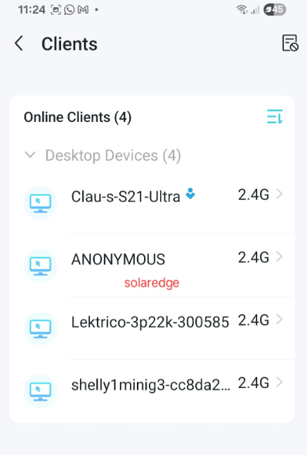 The SolarEdge inverter, being a bit shy, showed up as ANONYMOUS in the client list, but it was there.
