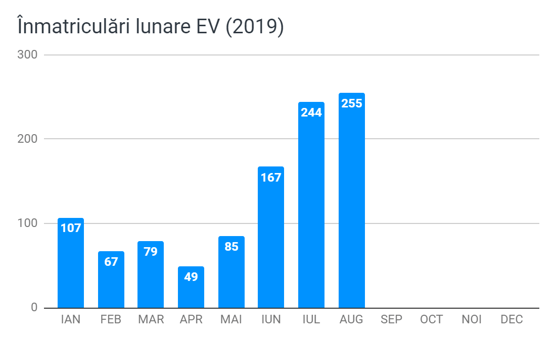 În 8 luni din 2019 s-au înmatriculat deja valoarea însumată a ultimilor trei ani (din 2016 până în 2018 inclusiv). Pragul de 3000 este tot mai aproape, iar în acest ritm putem spera chiar și la 3500 de BEV la final de an.