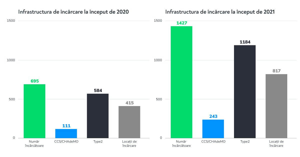 Infrastructura de încărcare a trebuit să țină pasul, sau altfel spus, a avut oportunitatea să profite de dorința românilor de a se alinia Europei de Vest în materie de electromobilitate și a reușit să se dezvolte cu peste 100% (să se dubleze) într-un singur an: