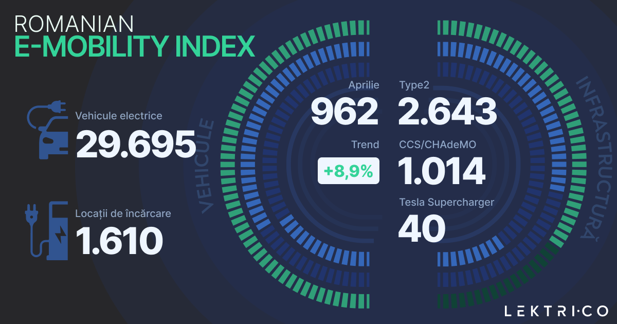 Luna Aprilie 2023 aduce o creștere de aproape 9% față de aceeași perioadă a anului trecut, înregistrându-se 962 de înmatriculări de vehicule electrice, din care 37 de vehicule comerciale LCV.