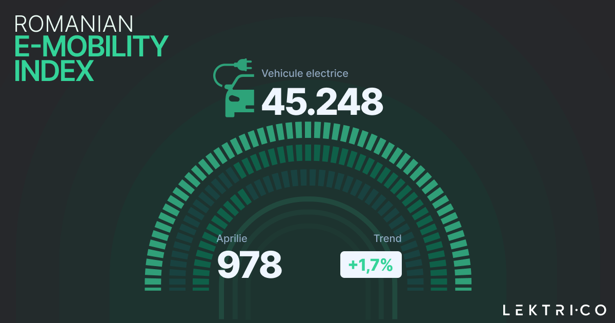 În luna Aprilie, în România, au fost înmatriculate 978 vehicule electrice (din care 63 vehicule comerciale ușoare LCV), reprezentând 5.1 % din totalul autovehiculelor noi înmatriculate.