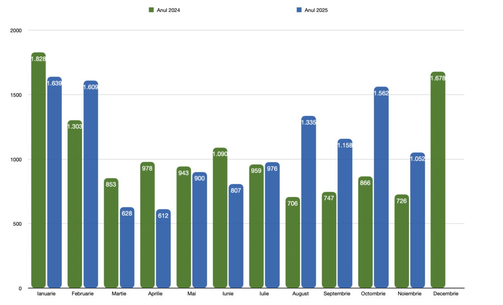 În noiembrie 2025 s-au înmatriculat cu semnificativ mai multe mașini electrice decât în Noiembrie 2024, ceea ce marchează o consolidare clară a interesului pentru e‑mobility în România. Conform graficului, în Noiembrie 2024 au fost înmatriculate 1.303 vehicule electrice, în timp ce în Noiembrie 2025 numărul a urcat la 1.052 de unități. Diferența este de 326 de mașini electrice în plus fata de aceeași perioada a anului trecut. Raportat procentual, luna Noiembrie 2025 este cu aproximativ 44% peste Noiembrie 2024 ca volum de înmatriculări
